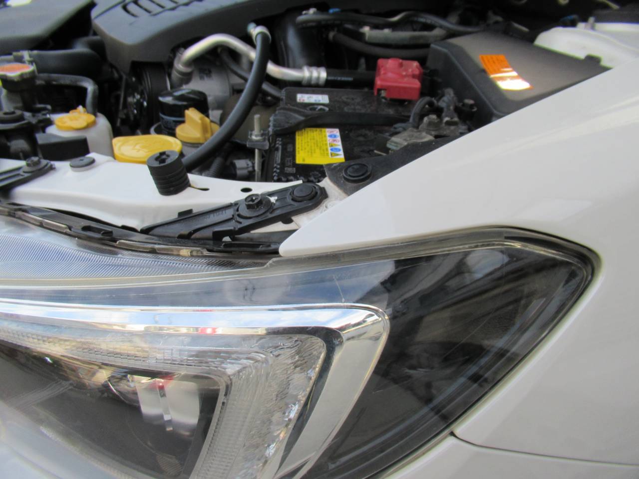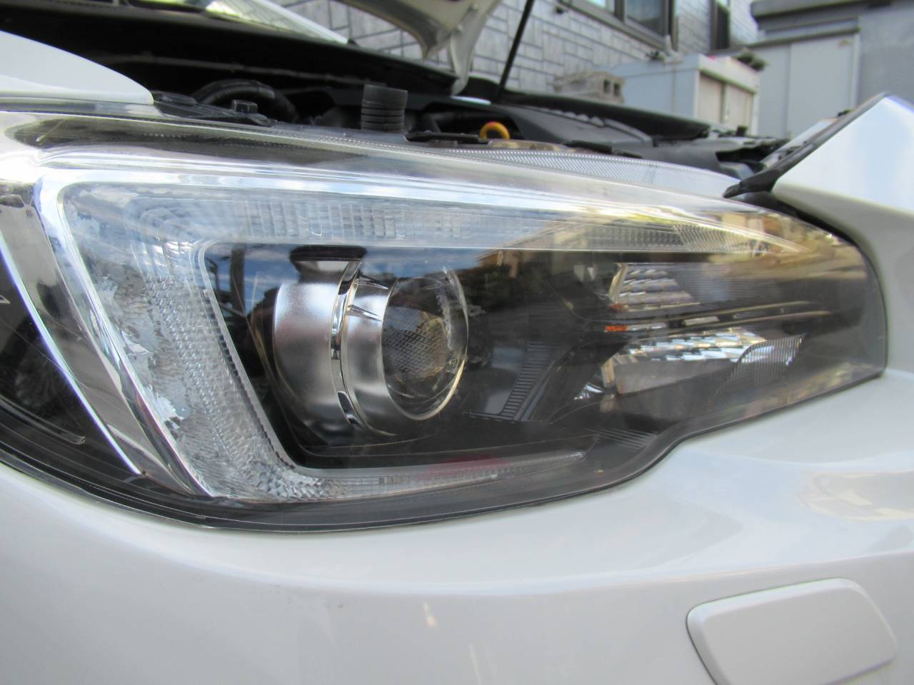 お車はスバルのレヴォーグ。ヘッドライトの表面のコート層が、経年劣化でムラに剥がれて醜くなってきたため、ムラが目立たなくなる様磨き上げ、その後の劣化防止でフィルム施工。